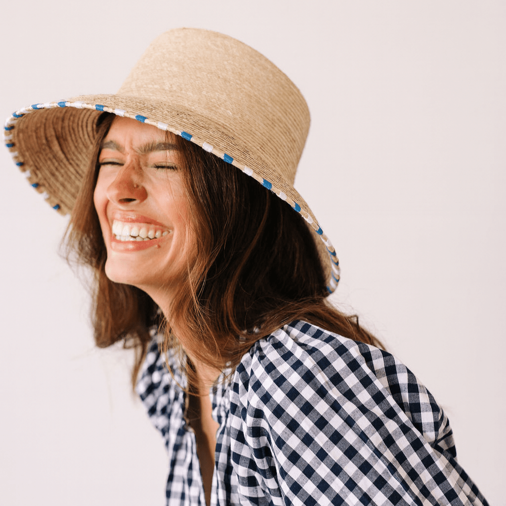 The Blue and White Bucket Hat features hand stitched blue and white stripes along the brim and is a part of our sustainable, fair trade hat collection and graded at the highest UPF rating.
