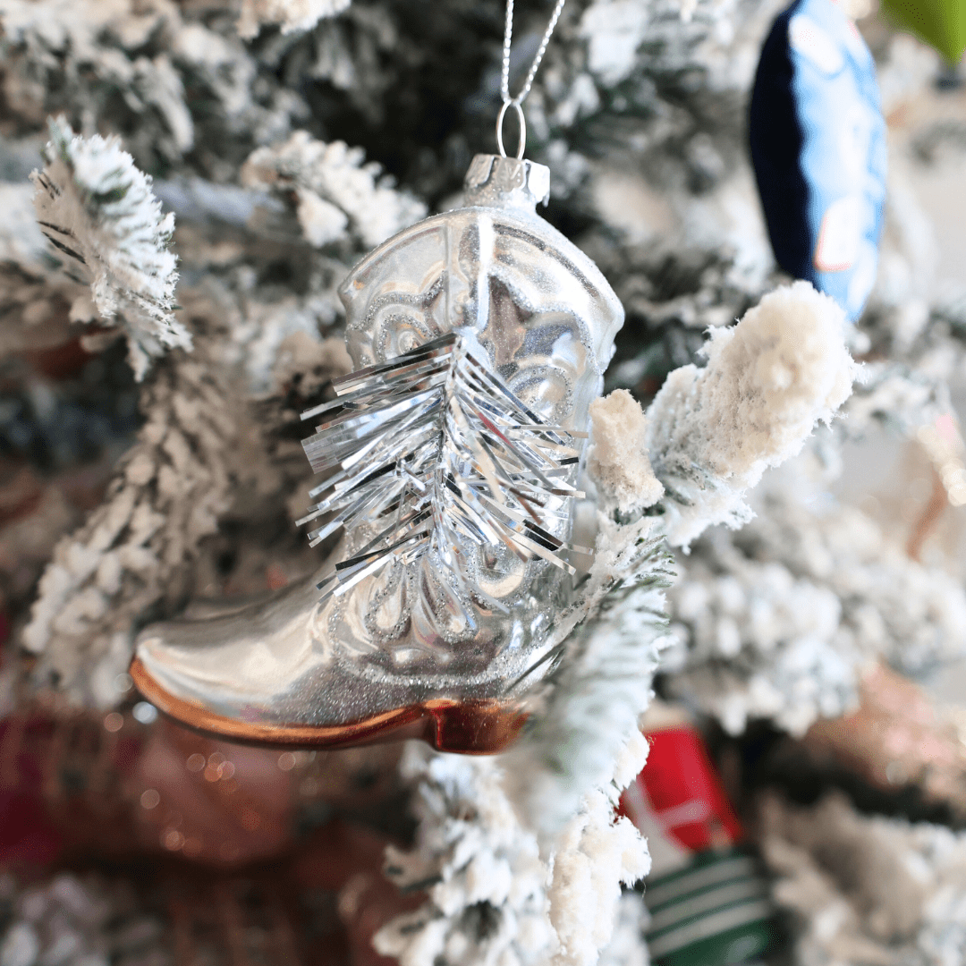Shine bright this holiday season with the Cowboy Boot Glass Ornament. Hand-painted with silver details and tinsel fringe, it brings a chic western-meets-disco vibe to any tree. Each glass ornament comes ready to hang with metallic string and arrives in a gift box—perfect for giving or keeping. Designed in the USA; imported.
