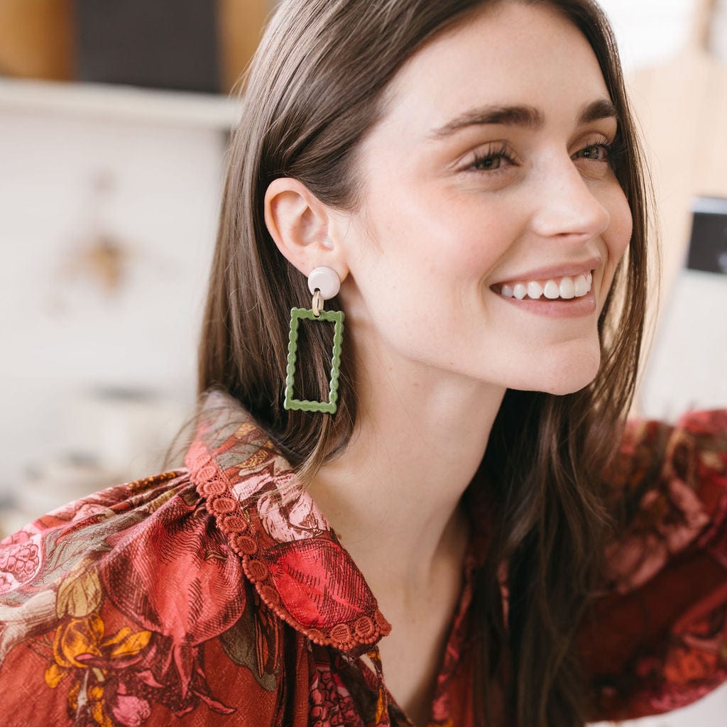The Colorblock Earrings is back in a new way! Featuring tiny, green dots with an ivory stud, these earrings are the new neutral perfect for any outfit.