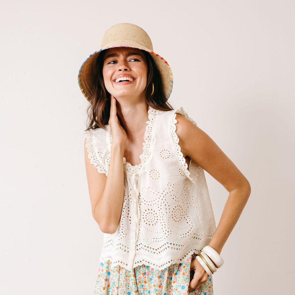 The Gabriela Bucket Hat features colorful whipstitching along the brim and is a part of our sustainable, fair trade hat collection and rated UPF 50+, the highest possible UV protection.