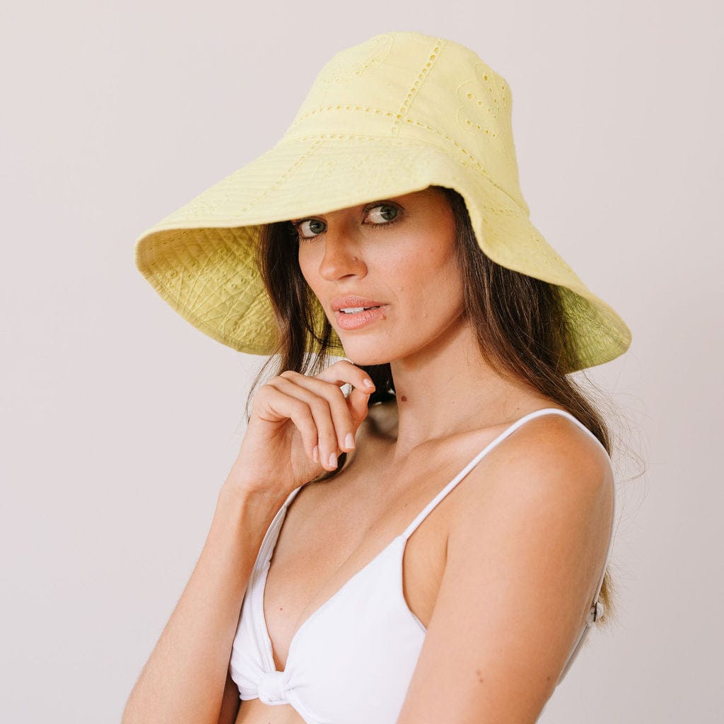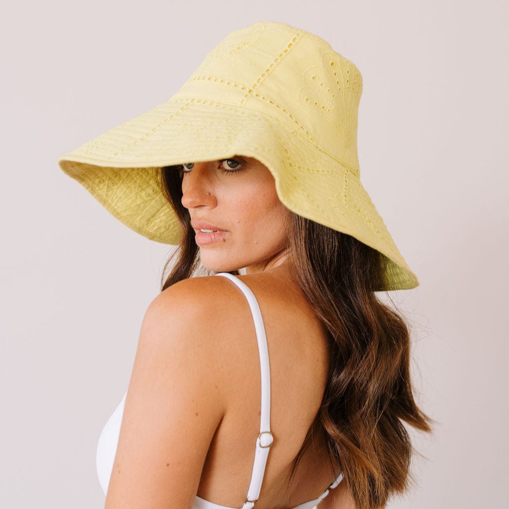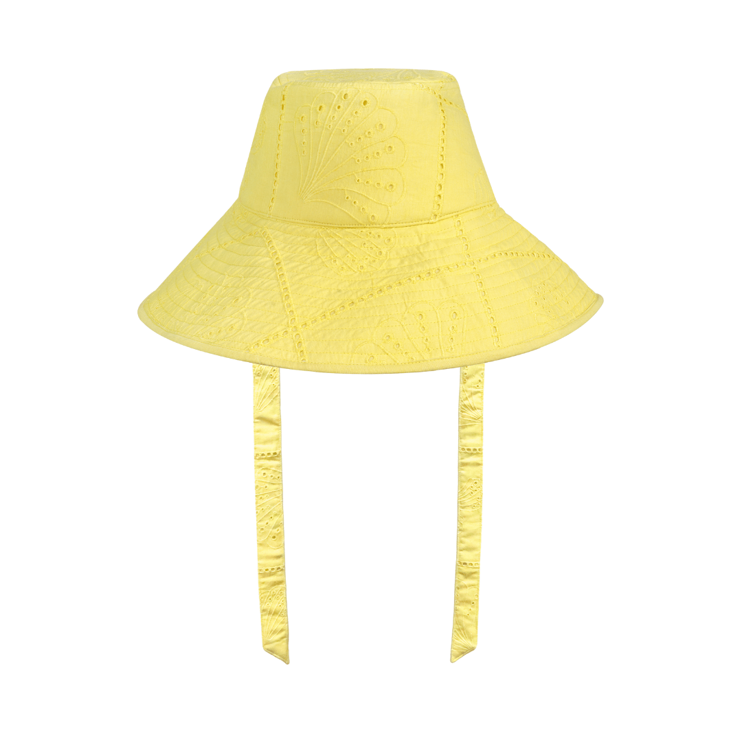 The Lemonade Shell Cotton Eyelet Beachy Bucket Hat is a playful essential for sunny adventures. Made eyelet cotton, this vibrant hat features yellow shell eyelet that radiate fun, beachy vibes.