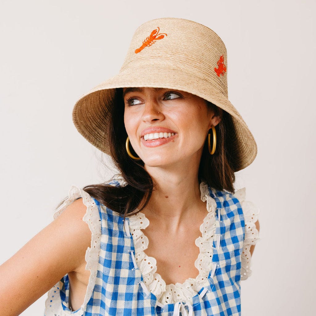 The Lobster Bucket Hat features red embroidered lobsters is a part of our sustainable, fair trade hat collection and rated UPF 50+, the highest possible UV protection.