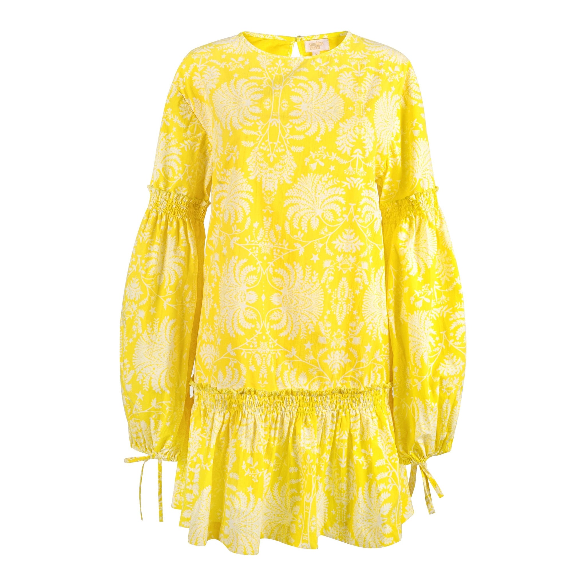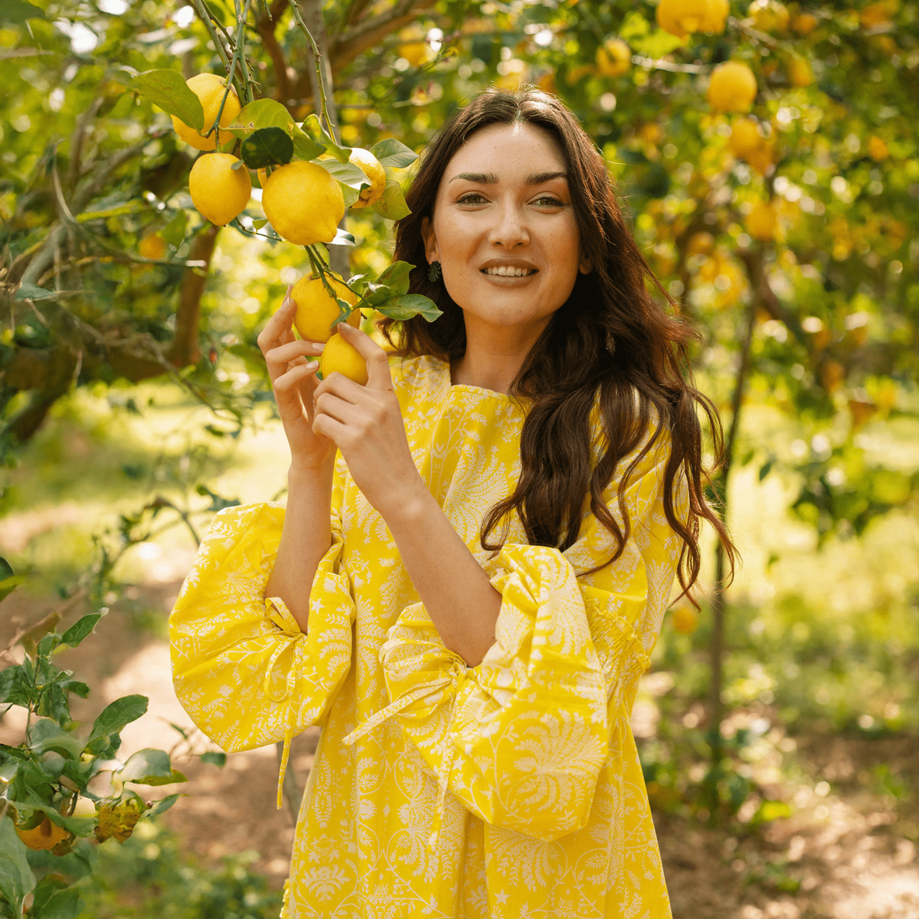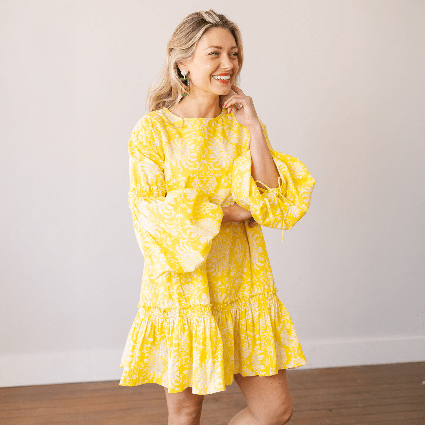 The Citron Gilded Palm Khai Mini Dress is a radiant statement piece, featuring vibrant yellow hues adorned with intricate palm motifs. With its billowy long sleeves, delicate ties, and playful ruffle hem, this dress is perfect for sunny days. Style tip: Throw a cozy pullover over your shoulders for an effortless, layered look!