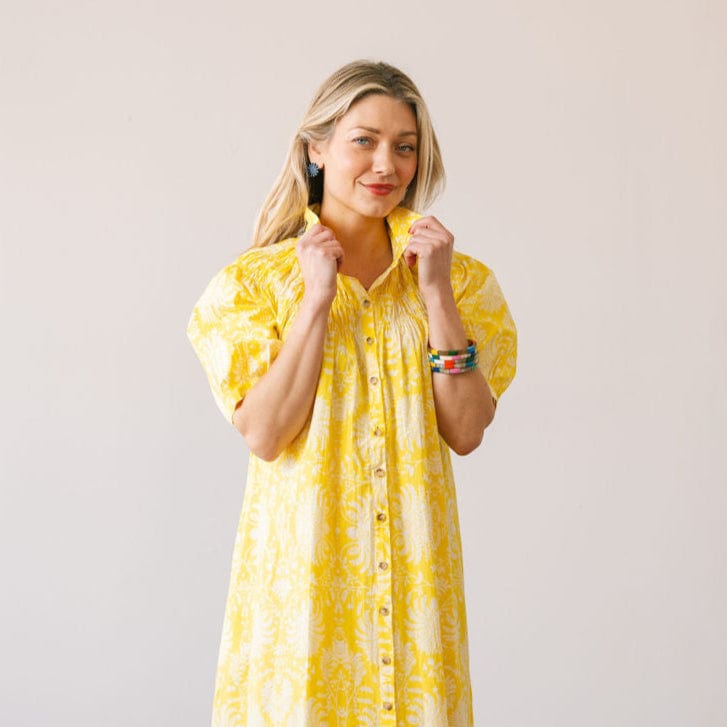 Step into sunshine with the Citron Gilded Palm Oasis Dress, featuring a stunning white botanical print on a vibrant yellow background. This button-front maxi dress blends elegance and comfort, with puff sleeves and a flowy silhouette perfect for bright, breezy days.