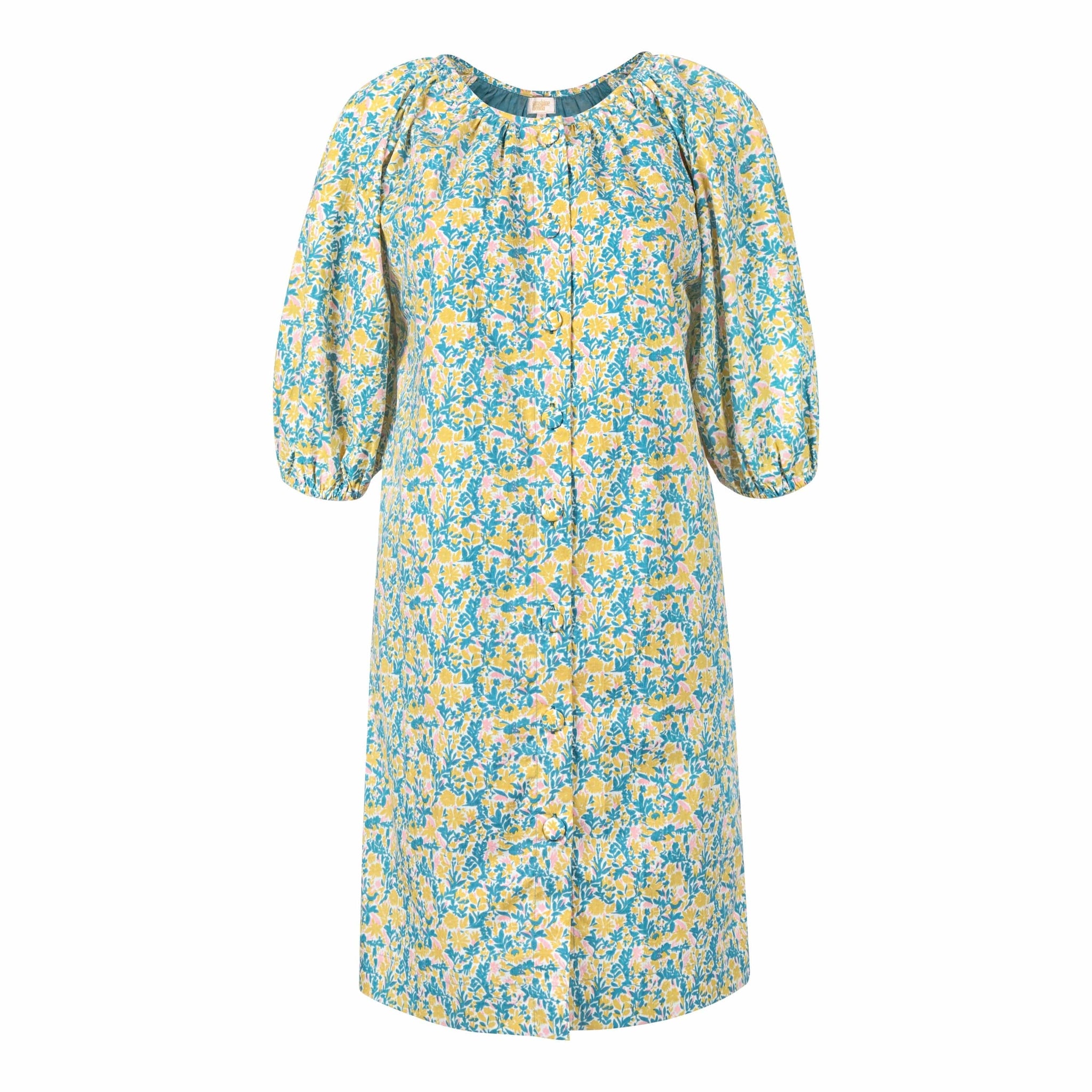 The Paradise Floral Catalina Mini Dress features a vibrant yellow and teal floral pattern, evoking the beauty of a tropical island. Designed with breezy puff sleeves and a relaxed fit, it's perfect for sun-soaked adventures or casual outings.
