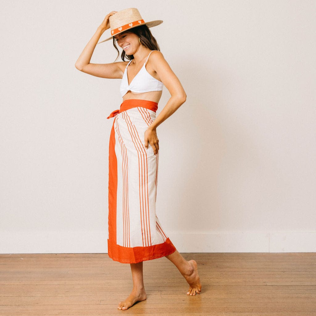 The Cherry Pinstripe Sarong, made from cotton voile, is a versatile beach cover-up that can be worn as a skirt, dress, or scarf. Stay stylish and comfortable with this easy-to-pack summer essential.