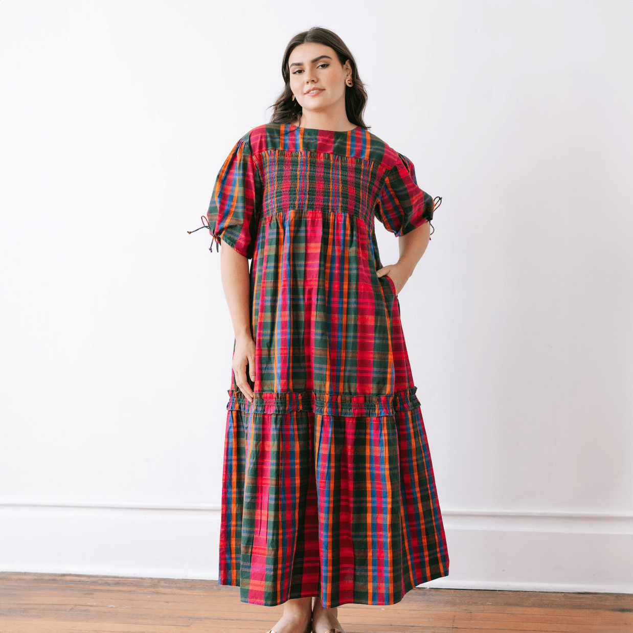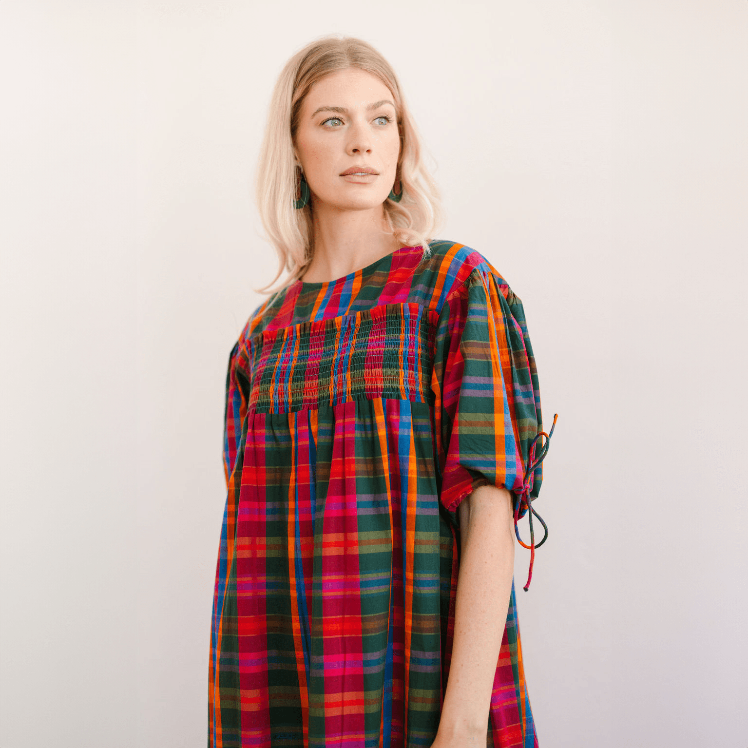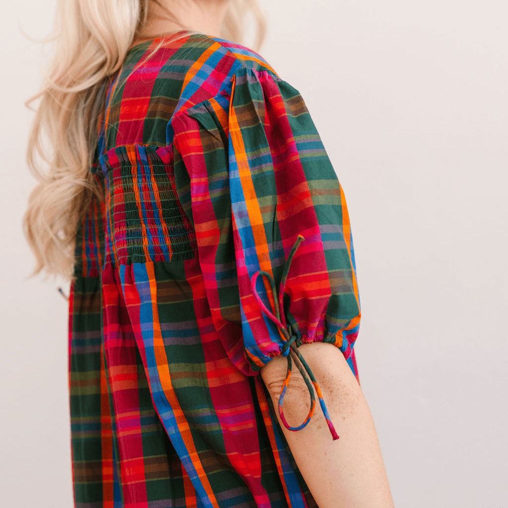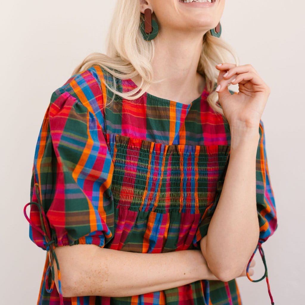 Get ready to fall for the Que Paso Katrin Dress! This lively new style features a smocked neckline and adjustable bubble sleeves with cute tie details. The colorful plaid print in rich autumn hues adds a pop of fun to your fall wardrobe.