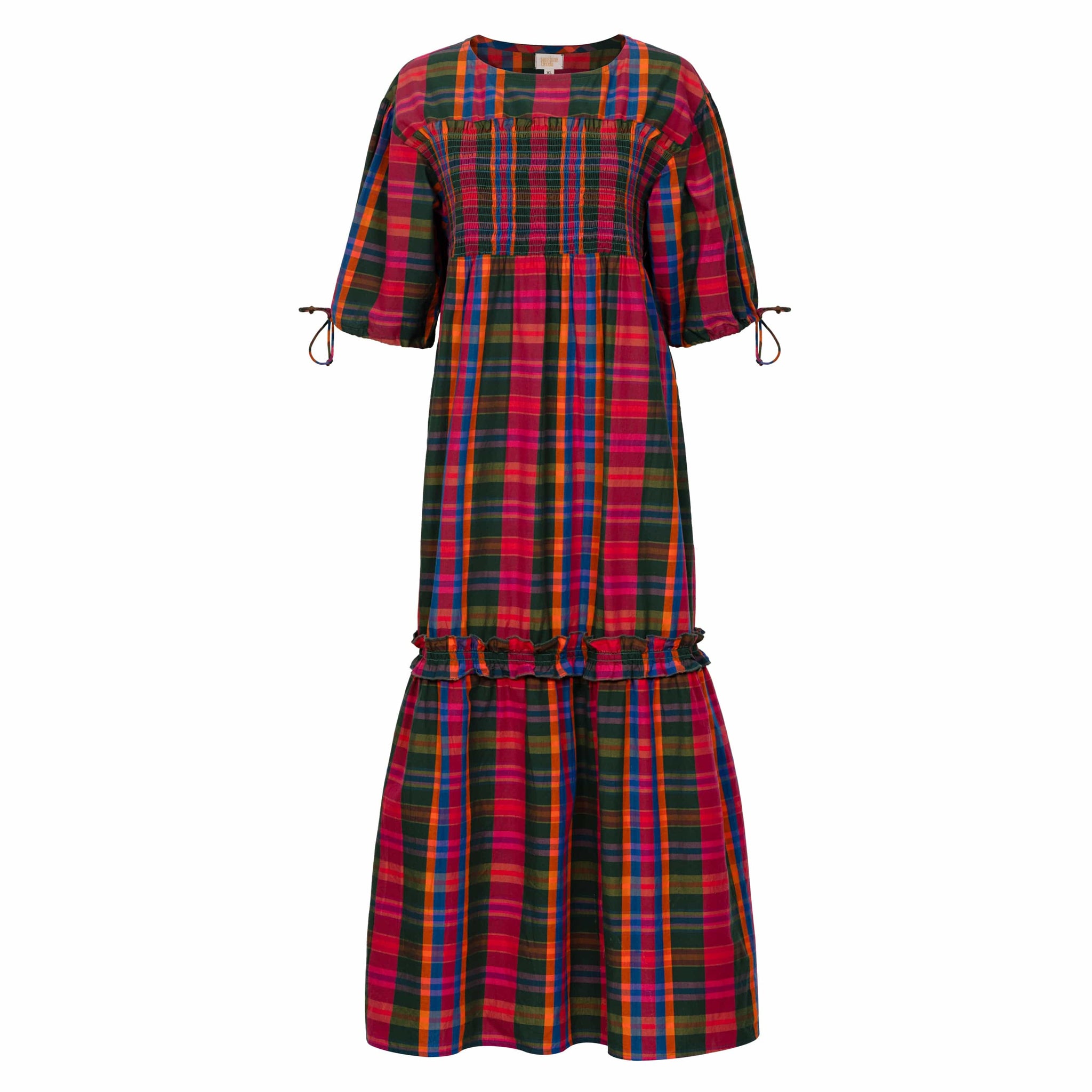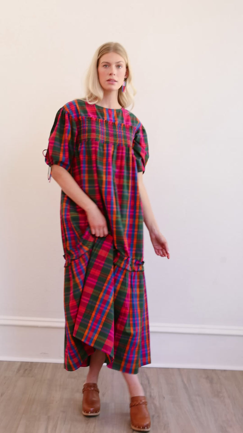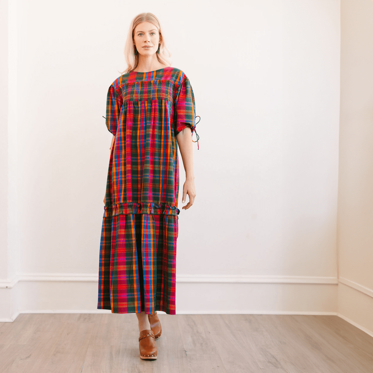 Get ready to fall for the Que Paso Katrin Dress! This lively new style features a smocked neckline and adjustable bubble sleeves with cute tie details. The colorful plaid print in rich autumn hues adds a pop of fun to your fall wardrobe.