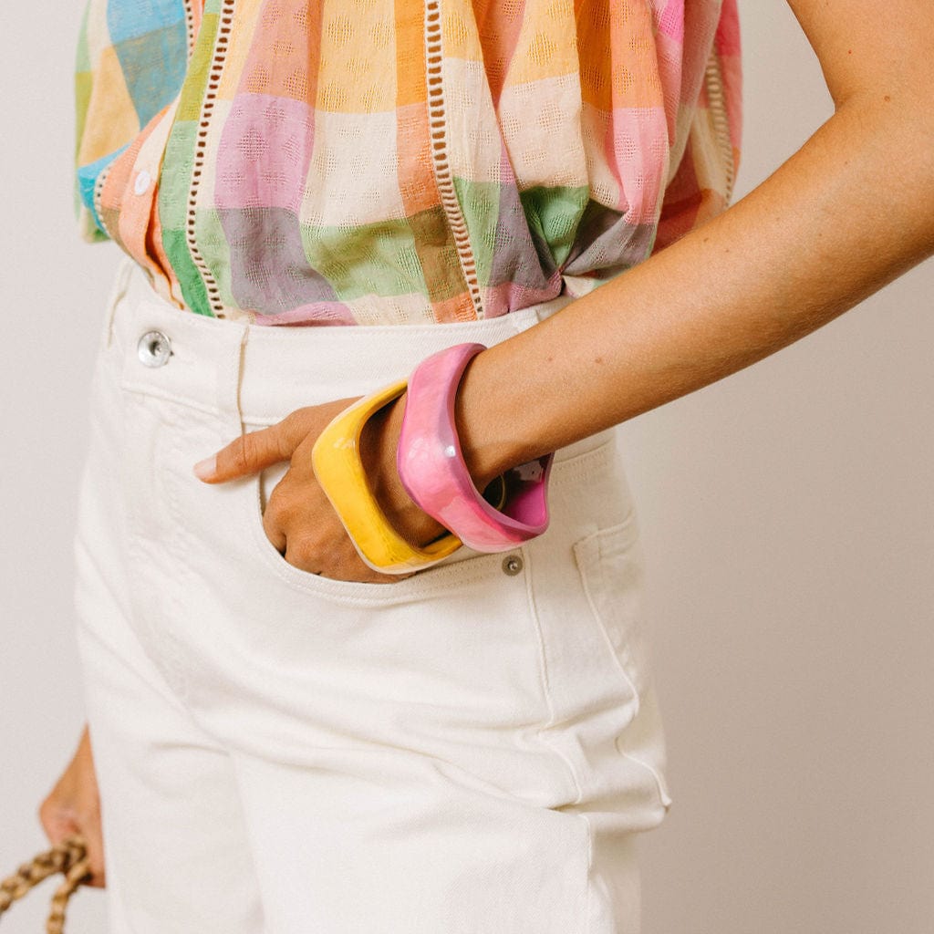 A fresh addition to our collection, the Pink Coral Bangle is crafted from lightweight buffalo horn with a shiny, translucent lacquer finish. Its wavy silhouette and vibrant hues add a bold yet breezy touch to any look.