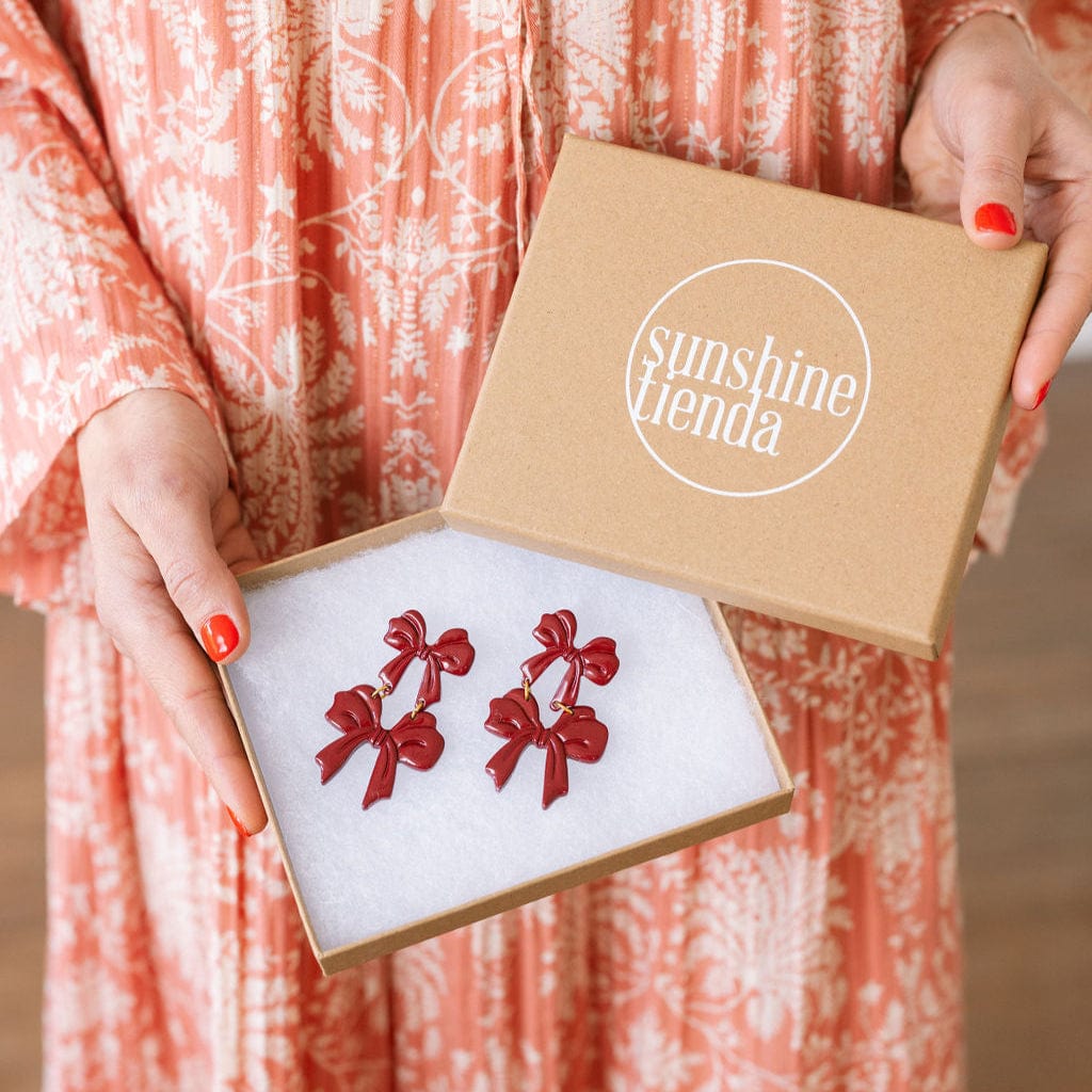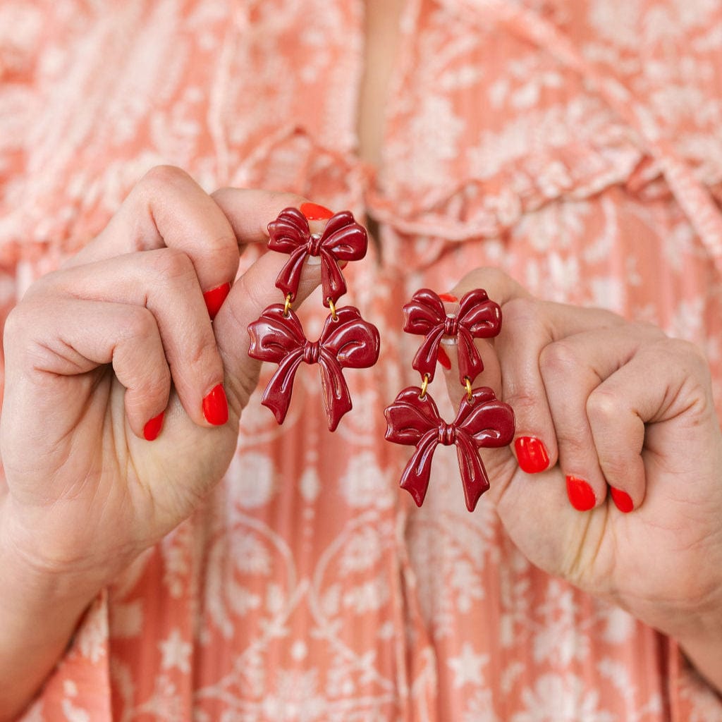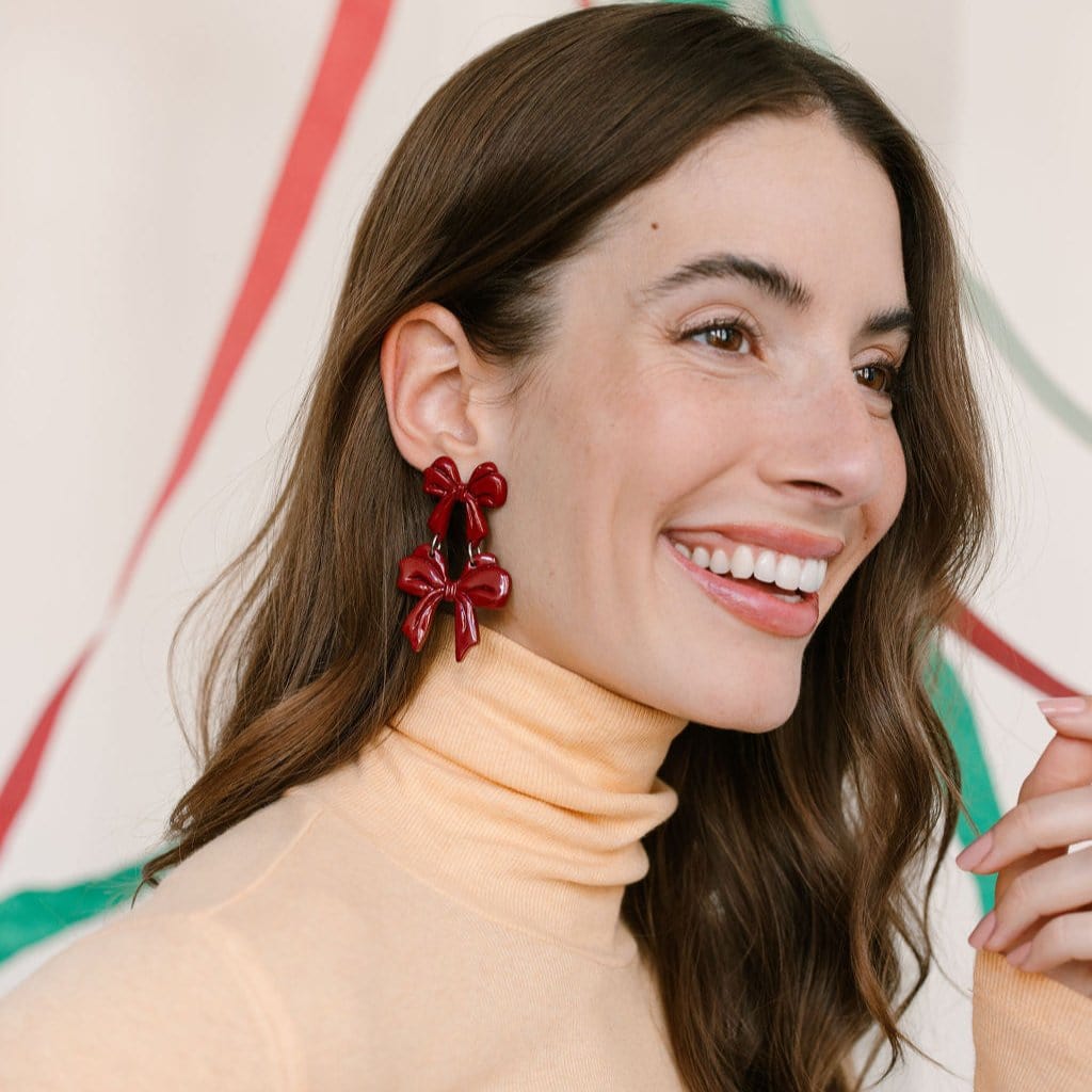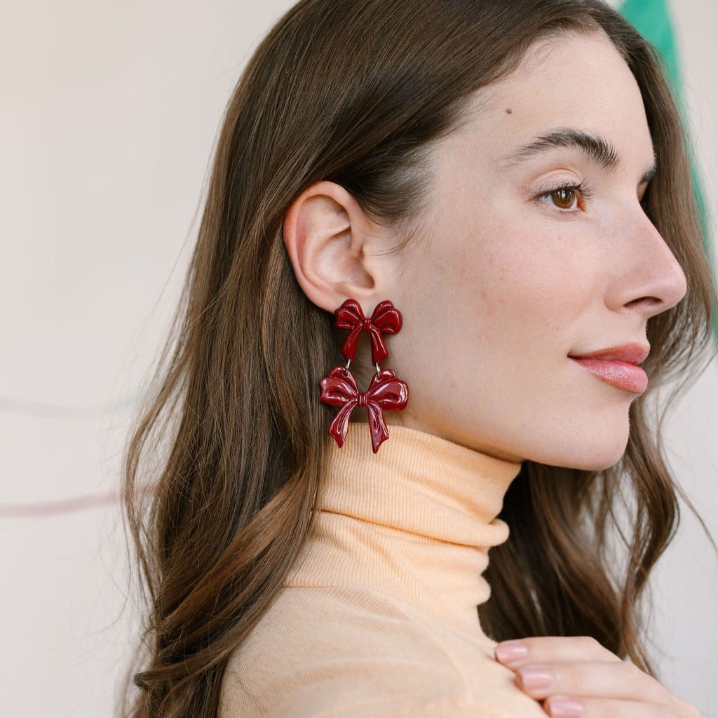 Add a festive flair to your holiday outfits with our Burgundy Bow Dangles. Featuring a playful double bow design in a rich burgundy hue, these statement earrings are perfect for celebrating the season in style. Lightweight and eye-catching, they’re the perfect accessory for holiday parties or winter gatherings.