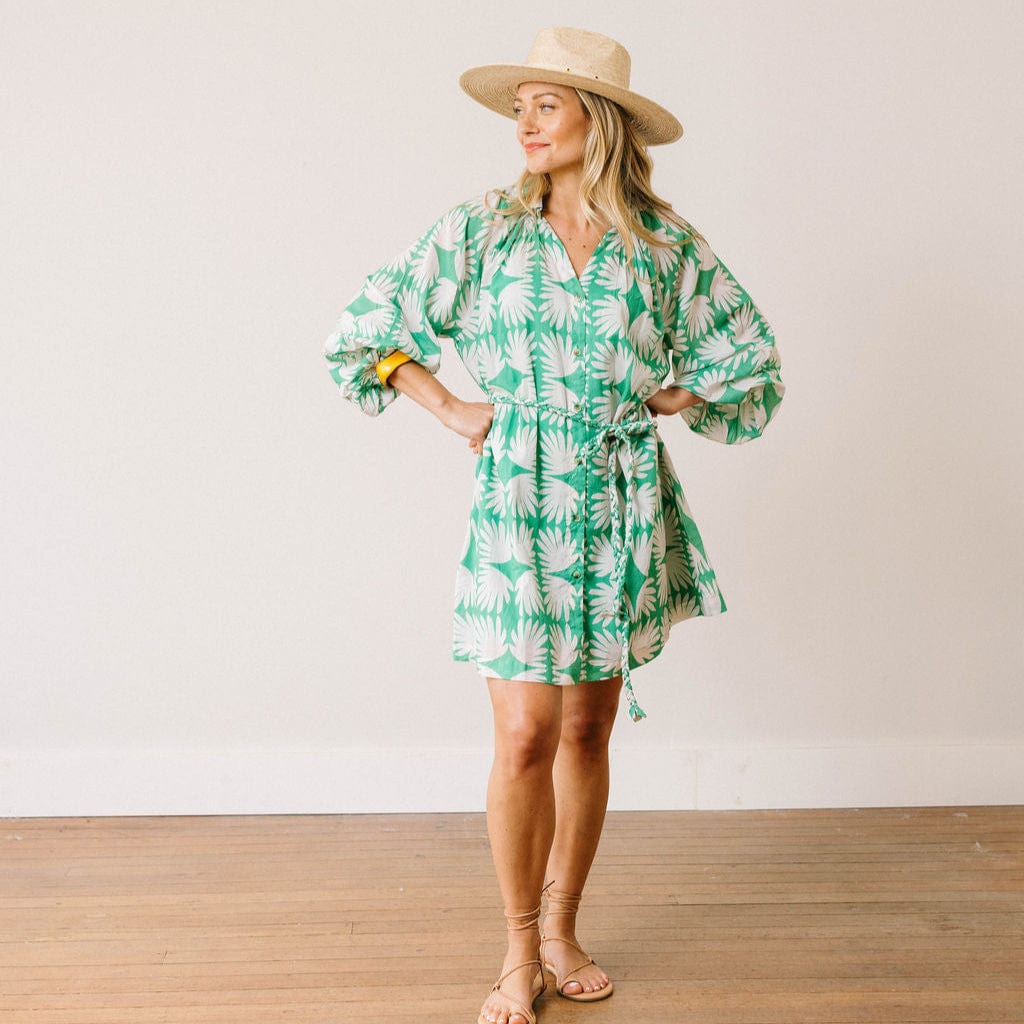 A versatile vacation staple. The Pippa Dress is a lightweight button-down dress with long blouson sleeves and an adjustable braided tie belt that lets you wear it two ways—belted for a cinched look or loose for an effortless tunic style. Whether layered over swimwear or worn on its own, it’s the perfect throw-on piece for beach days, resort lounging, or casual dinners.