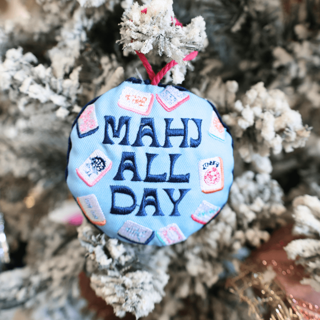 Mahj All Day Embroidered Mahjong Ornament celebrates your favorite pastime with this handcrafted mahjong embroidered ornament. It's the perfect keepsake or stylish seasonal decoration for anyone who loves the game. Great for ornament exchanges or to personalize your Christmas tree.