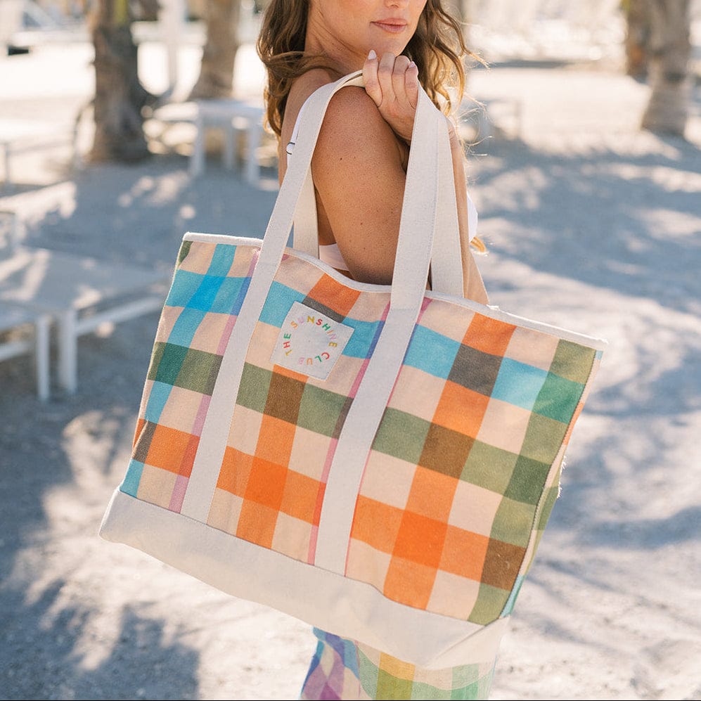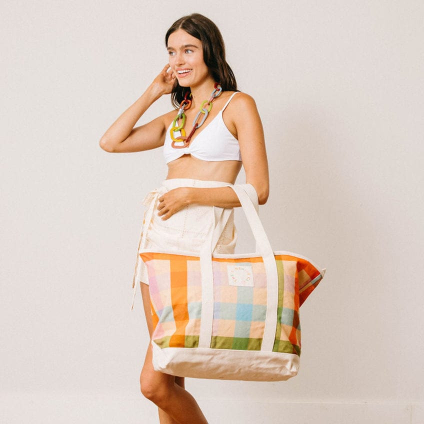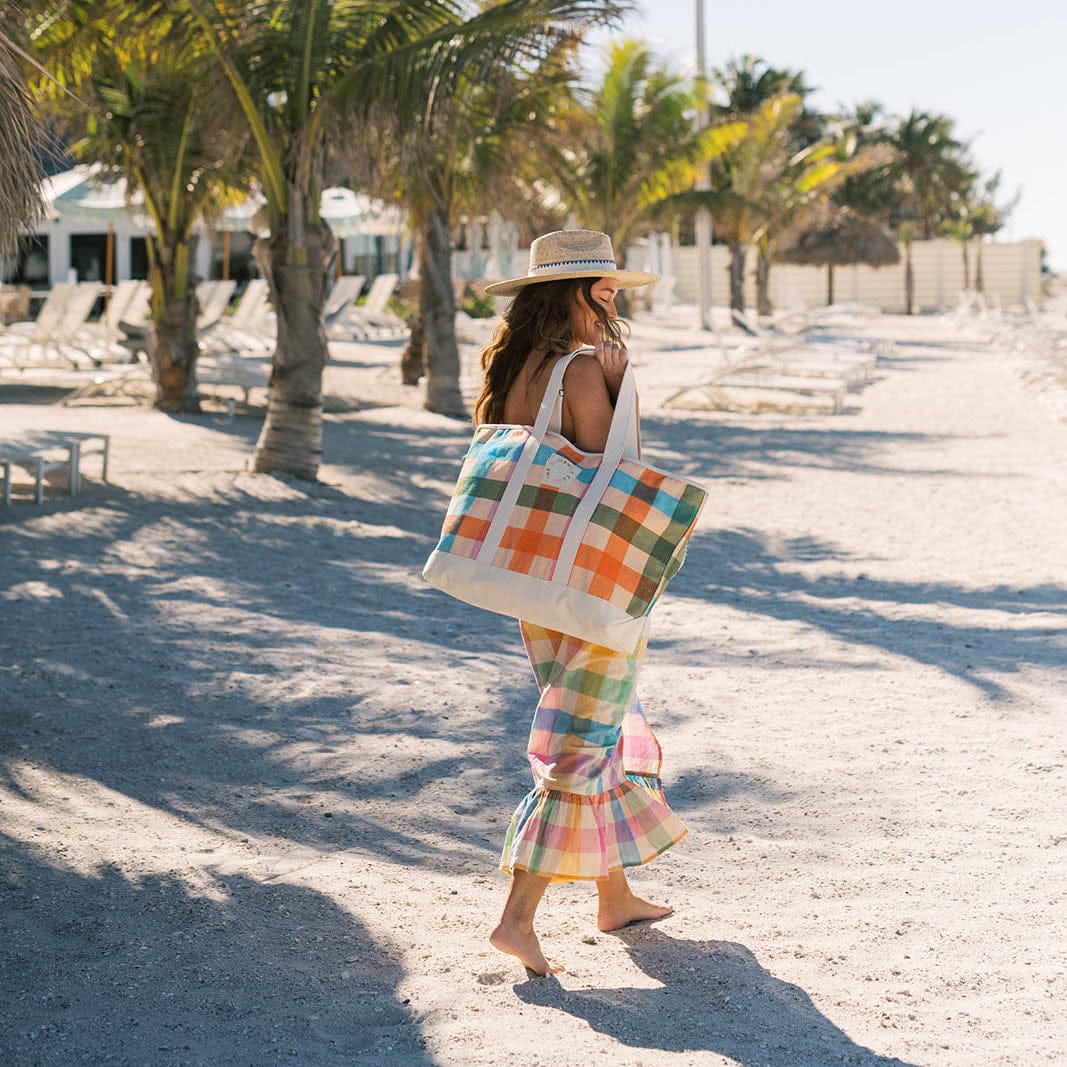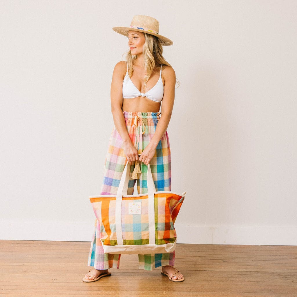 The Rainbow Plaid Canvas Tote is a bold and fun carryall, featuring a beautiful rainbow plaid print with a full zip closure. Crafted from durable canvas, this spacious tote is perfect for beach days, shopping trips, or casual outings. Its sturdy design and playful colors make it both practical and stylish for all your summer adventures.