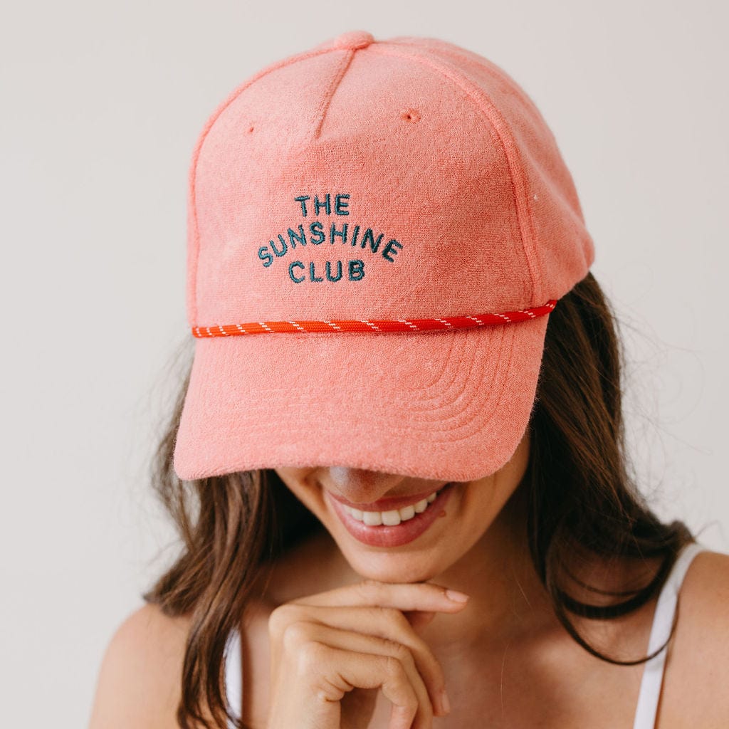 Meet your new sunny-day staple. Our Strawberry Terry Trucker Hat is crafted from soft, towel-like terry fabric in a vibrant strawberry pink hue and finished with The Sunshine Club embroidery for a playful, feel-good touch. Designed in a classic trucker silhouette with an adjustable back, it’s made for beach days, poolside lounging, and everyday moments that call for a little extra sunshine.