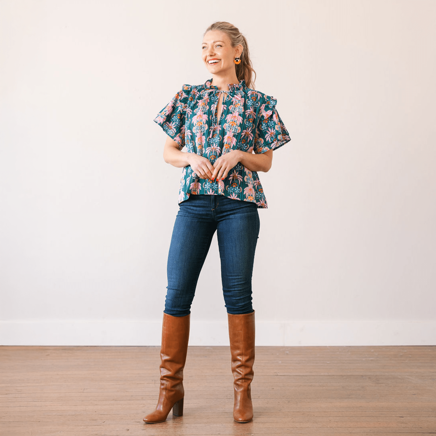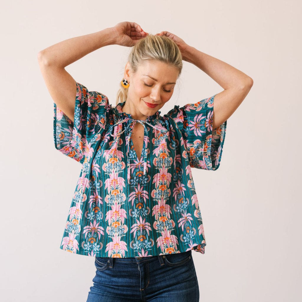 The Palm Royale Gemma Top showcases a tropical-inspired print with vibrant pink, blue, and orange hues on a rich teal background. Featuring flutter sleeves and a tie-front neckline, this top adds an exotic touch to your wardrobe, perfect for vacations or lively outings.
