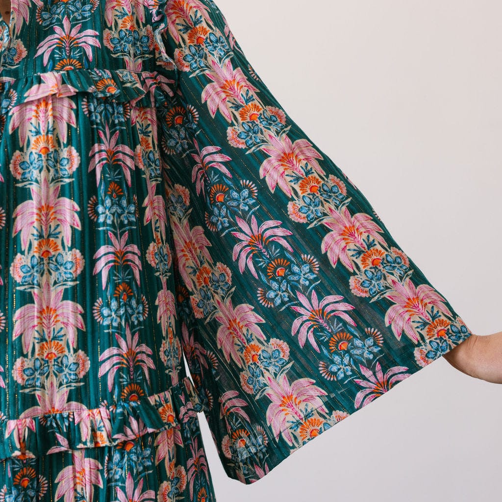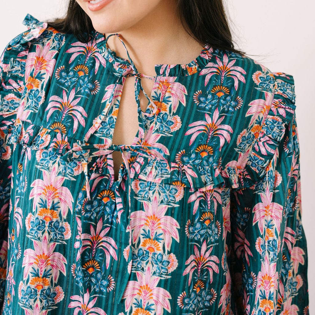 Escape to paradise in the Palm Royale Paradise Maxi Dress, showcasing a lush, tropical print with vibrant florals and shimmering accents. This breezy silhouette features ruffle detailing and a flattering tie neckline, perfect for a statement-making resort look.