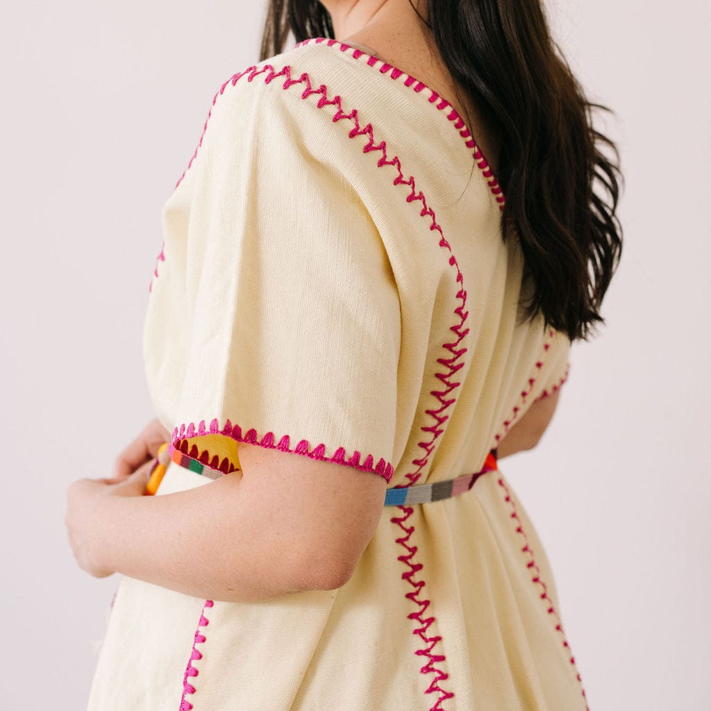 Handwoven by skilled Guatemalan artisans, our caftans are a true labor of love. From yarn preparation and intricate loom weaving to hand-stitched embroidery, each step honors generations of craftsmanship—just like our iconic palm hats. Built to last and made to shine, these caftans are stitched with heart and made for endless wear. The Verónica Caftan keeps it classic with a soft ivory base trimmed in bold magenta stitching, and comes with a colorful, striped belt for a playful pop of personality.