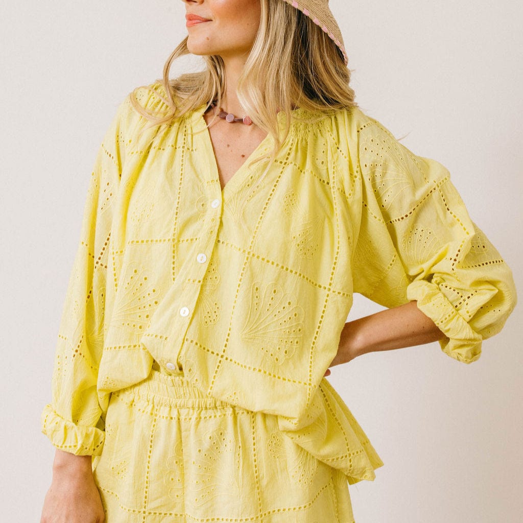 A lightweight button-down made for breezy days. The Lucia Top features a relaxed fit with long blouson sleeves, smocked shoulder details, and delicate embroidery. Designed for vacation ease, this versatile style pairs effortlessly with shorts, denim, or as a chic layer over your favorite swimsuit.