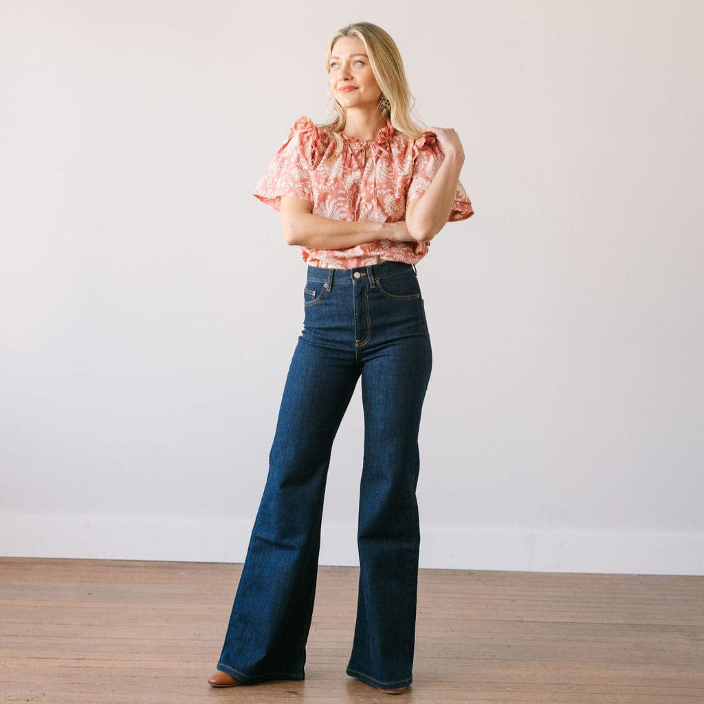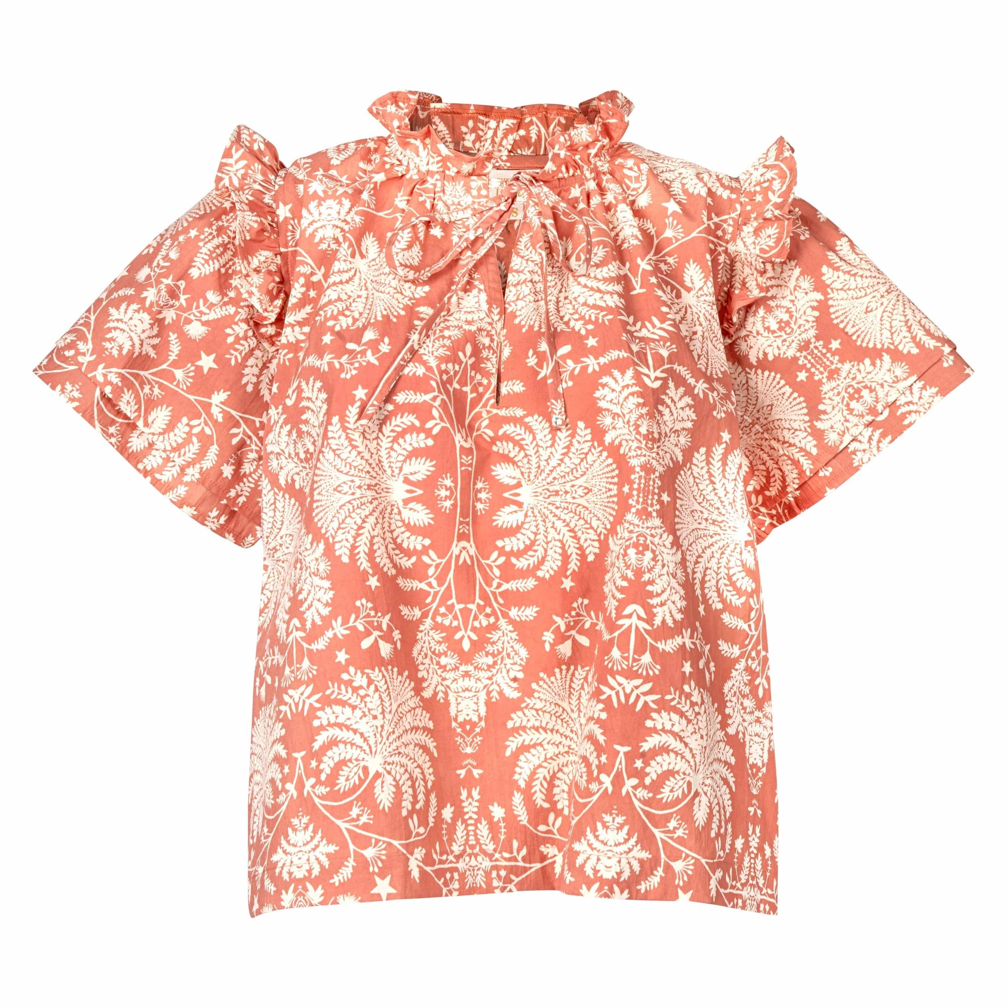 The Rose Gilded Palm Gemma Top features an intricate ivory palm print on a soft rose background, exuding timeless elegance. Designed with flutter sleeves and a tie-front neckline, it’s a chic and versatile choice for day-to-night dressing.