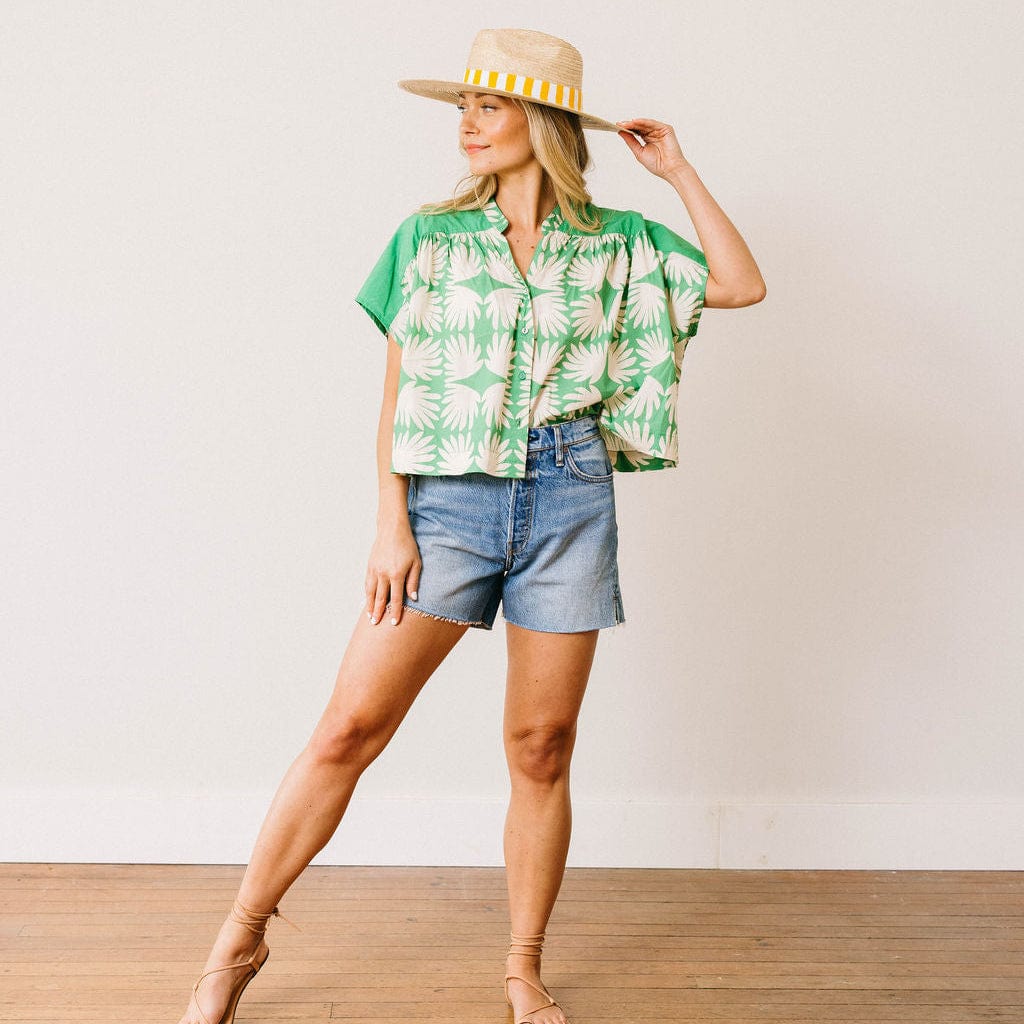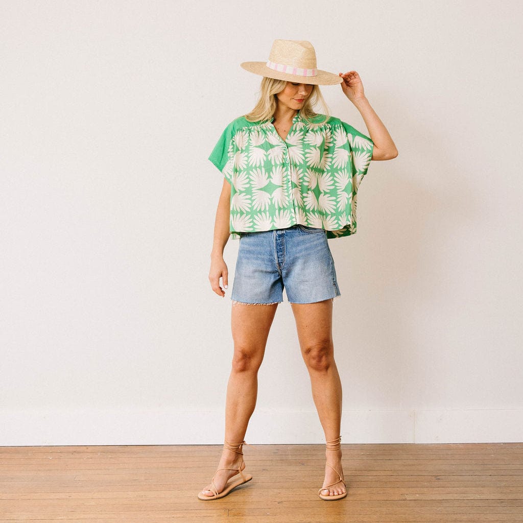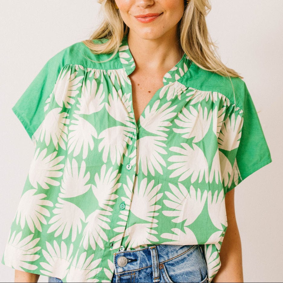 An easy button-down built for sunny days. The Savannah Top features a relaxed, cropped silhouette with a flattering V-neckline, gathered shoulders, and short sleeves. Lightweight and breezy, this versatile vacation shirt pairs perfectly with high-waisted pants, shorts, or swimsuits for an effortless resort-ready look.